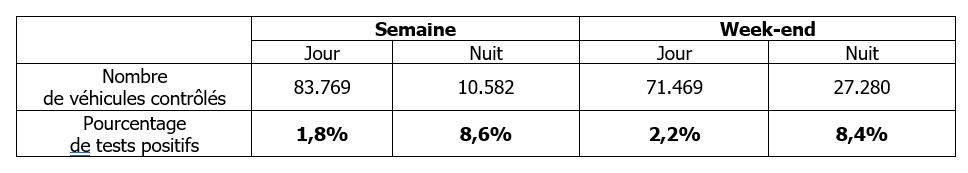 Sur 191.397 tests effectués, seuls 6279 conducteurs, soit 3,3 % de l'ensemble des conducteurs, ont été positifs. La grande majorité de ces conducteurs avaient un taux d'alcool supérieur à 0,8 %.