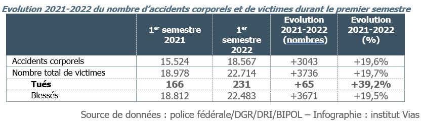 Au cours des 6 premiers mois de l’année, le nombre de tués a connu une hausse de +39% en comparaison de 2021 (soit 231 tués contre 166). Le nombre de personnes décédées atteint ainsi quasiment le même niveau qu’en 2019, dernière année précédant la pandémie. A l’époque, on avait recensé 236 personnes disparues dans la circulation au cours du 1er semestre.