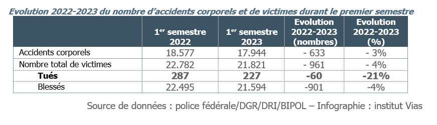 Au cours des 6 premiers mois de l’année, le nombre de tués est en baisse de 21% en comparaison de la même période de 2022 (soit 227 tués contre 287). A part en 2021 (année Covid), il n’y a jamais eu si peu de tués sur nos routes au cours d’un 1er semestre, ce qui est évidemment positif. Il n’en reste pas moins que 9 personnes meurent en moyenne chaque semaine sur les routes de notre pays, ce qui reste beaucoup trop.