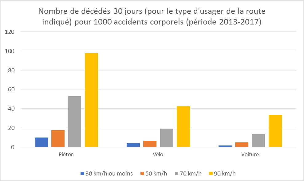 En 2017, il y a eu 2420 accidents dans des zones limitées à 30 km/h, soit 6% de tous les accidents. Par contre, on y a recensé « que » 2% des personnes tuées (12 victimes). Les accidents impliquant des piétons dans des zones 30 sont quasiment 2 fois moins mortels que dans les zones limitées à 50 km/h et 5 fois moins mortels que dans les zones à 70 km/h. En effet, on recense 10 piétons tués pour 1000 accidents en zone 30 ; 18 en zone 50 et 53 en zone 70.