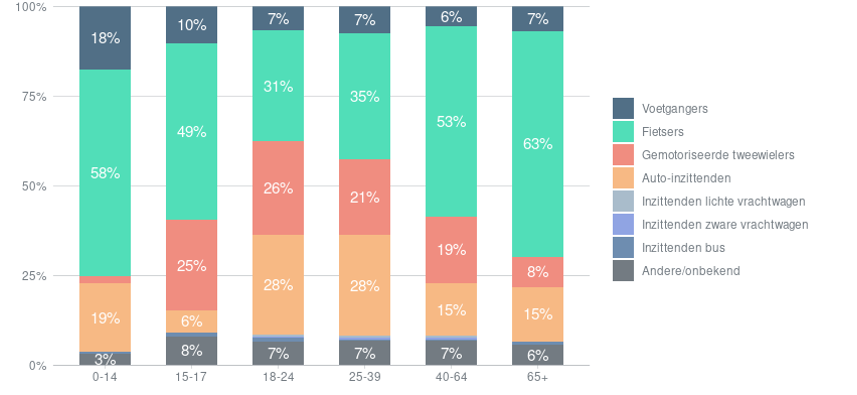 Het merendeel van de ernstig gewonden is tussen de 40 en 64 jaar oud (38%) of ouder dan 65 jaar (31%). Bij de jongste weggebruikers tussen 0 en 14 jaar oud daalde het aantal ernstig gewonden de afgelopen jaren fors