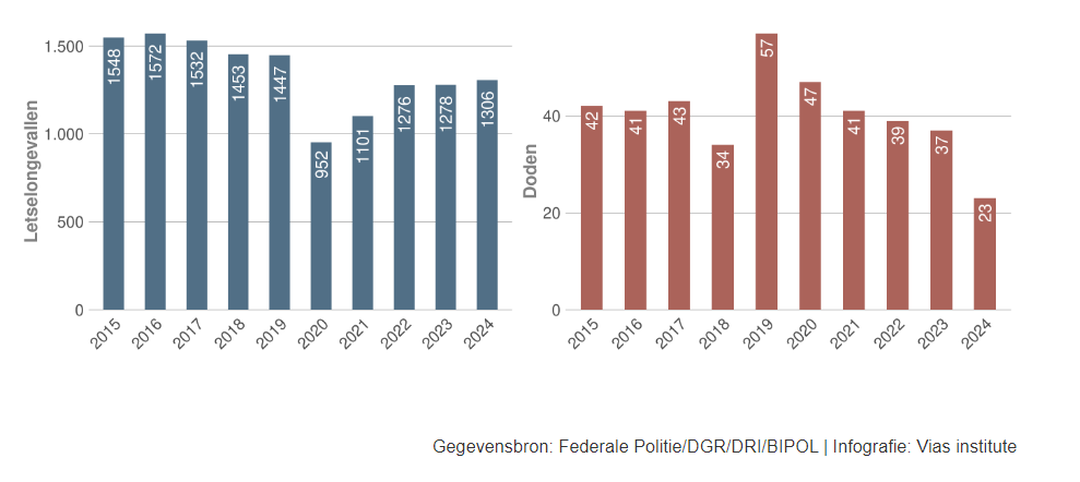 Het aantal letselongevallen daalt licht in de 3 regio’s: van 11.227 naar 10.662 ongevallen in Vlaanderen (-5%), van 4825 naar 4682 ongevallen in Wallonië, (-3%) en van 1896 naar 1813 ongevallen in Brussel (-4%).