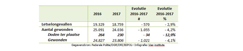 Het aantal gewonden daalt ook (van 24.827 naar 23.806, of -4,1%), net zoals het aantal ongevallen (van 19.329 naar 18.759, ofwel -2,9%). Voor al deze indicatoren werden sinds de start van de verkeersveiligheidsbarometer nooit lagere cijfers genoteerd.