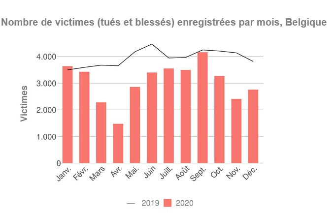 Selon le dernier baromètre de la sécurité routière de l’institut Vias basé sur les données de la Police fédérale, le nombre de tués sur les routes a baissé de 22% en 2020 par rapport à 2019 et le nombre de blessés de 23%. Ces diminutions sont évidemment imputables aux mesures de restriction en matière de déplacements, notamment en avril et en novembre. En dépit de cette baisse probablement due aux circonstances exceptionnelles, l’objectif fixé pour la décennie 2010-2020, à savoir réduire de 50% le nombre de tués sur les routes, n’a toutefois pas été atteint. On arrive néanmoins à une diminution de 40%. Parmi les tendances à surveiller, le seuil de 1000 accidents impliquant un cycliste a, pour la première fois, été franchi sur une année, tant en Wallonie qu’à Bruxelles, même si aucun décès n’est à déplorer dans la capitale.