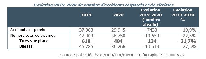 Le nombre de tués a baissé sur nos routes en 2020: -22% par rapport à 2019 (soit 484 tués contre 618 en 2019). Le nombre de blessés est également en baisse (de 46.785 à 36.266, soit -23%), ainsi que le nombre d’accidents (de 37.383 à 29.945, soit -20%).