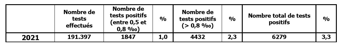 Sur 191.397 tests effectués, seuls 6279 conducteurs, soit 3,3 % de l'ensemble des conducteurs, ont été positifs. La grande majorité de ces conducteurs avaient un taux d'alcool supérieur à 0,8 %.