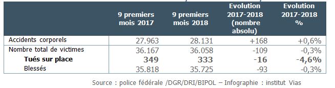 Pour le Ministre de la Mobilité François Bellot: « Ces résultats provisoires indiquent une évolution favorable de la sécurité sur nos routes. On peut se réjouir de ces chiffres positifs, dans la lignée de l’évolution déjà observée en 2016 par rapport à 2015. Mais nous devons faire mieux encore : sur les 6 premiers mois de l’année, près de 24.000 personnes ont été blessées ou tuées dans un accident de la circulation, soit plus de 130 par jour. Pour continuer progresser, d’autres mesures entreront bientôt en vigueur, notamment l’obligation de l’éthylotest embarqué pour tout conducteur condamné après avoir été contrôlé avec une alcoolémie d’au moins 1,8 ‰ ou 1,2 ‰ pour les récidivistes, ainsi que le renforcement des sanctions contre les auteurs de délits de fuite ».