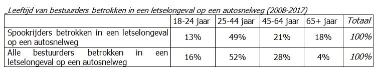 Bijna 1 spookrijder op 5 (18%) die betrokken raakt bij een ongeval, is ouder dan 65 jaar. Nochtans zijn senioren slechts betrokken bij 4% van alle letselongevallen op autosnelwegen. Spookrijden komt dus relatief gezien veel vaker voor bij senioren dan bij jongeren. Maar in absolute cijfers zijn er de meeste spookrijders bij de 25-44 jarigen (58 tegen 21 voor de bestuurders ouder dan 65 jaar).