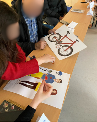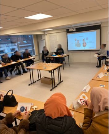 Beelden van een bewustmakingsworkshop over verkeersveiligheid, waar deelnemers van verschillende leeftijden en achtergronden (jonge tieners, nieuwkomers) in een educatieve omgeving met elkaar in contact komen.